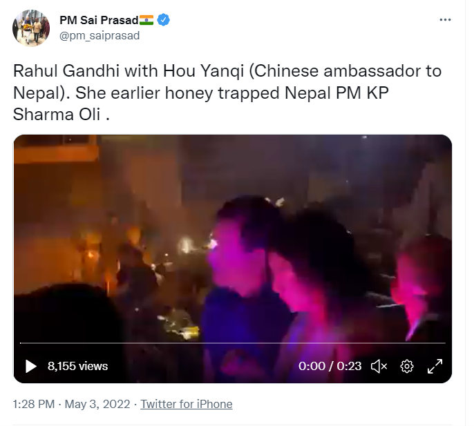 推特、脸书等社交平台近日流传一段22秒左右的视频。多位印度政客兼推特认证用户声称,视频展现了印度国会议员拉胡尔·甘地在尼泊尔当地一家夜总会与中国驻尼泊尔大使侯艳琪聚会,暗示其可能中了中方的“美人计”(honey traps)。