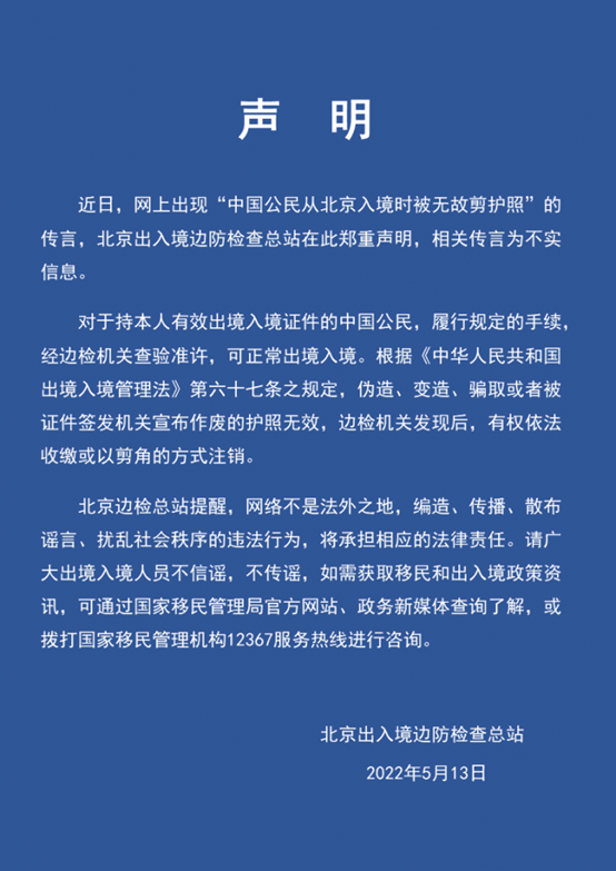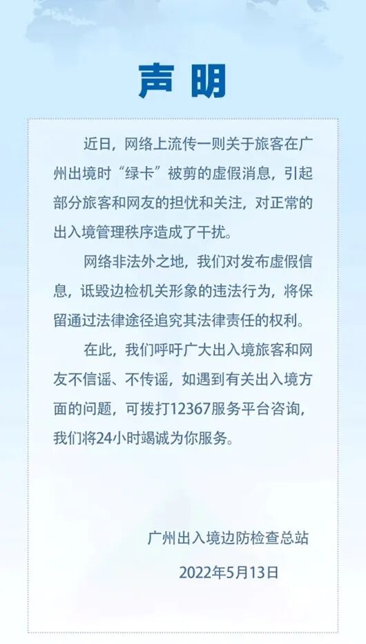 5月13日,北京、上海、广州等多地出入境边防检查总站各自发表声明称,近期在中文网络上流传的多条声称中国公民在出入境时护照被剪的消息不实。国家移民管理局亦向“澎湃新闻”确认,有关“停办护照”“绿卡剪角”等传言不实,广大出入境人员遇有出入境问题,可通过当地出入境管理部门服务窗口、国家移民管理局政务网站、微信微博政务新媒体平台或拨打“12367”24小时服务热线咨询了解相关政策,准确掌握权威信息。