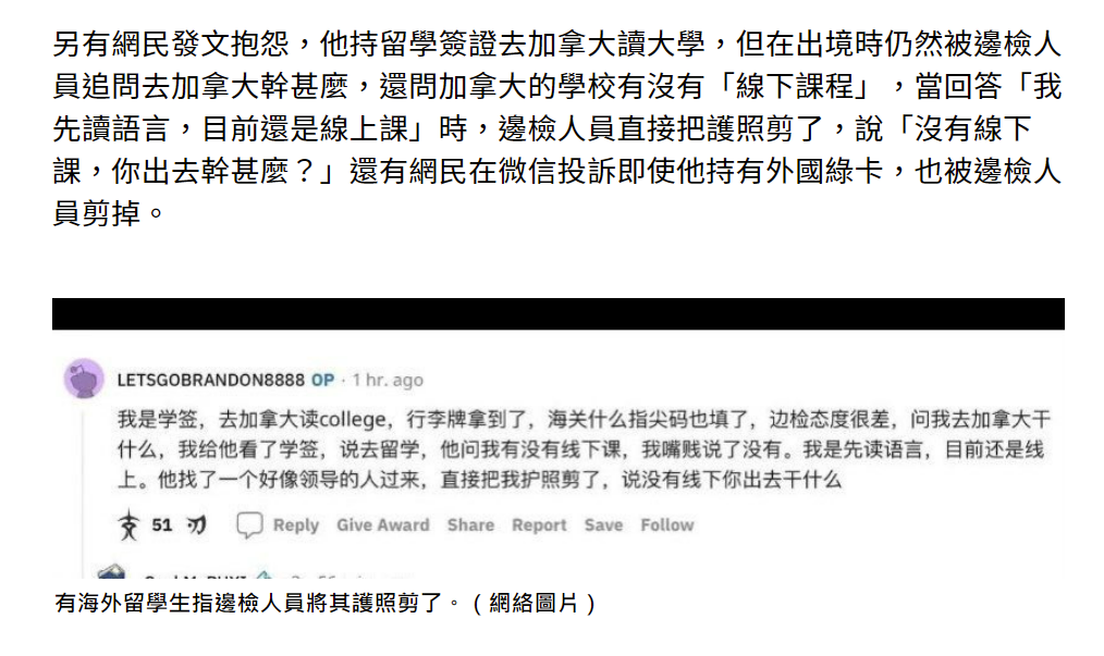 中文网络近日出现多条声称中国公民从北京、上海、广州等地出入境时“护照被剪”的消息。5月10日,由美国国会授权设立并拨款的媒体rfa发布文章称,一位持留学签证去加拿大读大学的中国公民在出境时“被边检人员追问去加拿大干什么,还问加拿大的学校有没有‘线下课程’,当回答‘我先读语言,目前还是线上课’时,边检人员直接把护照剪了”。