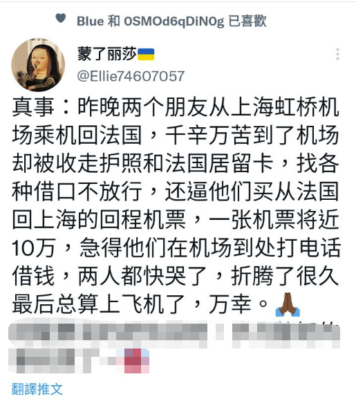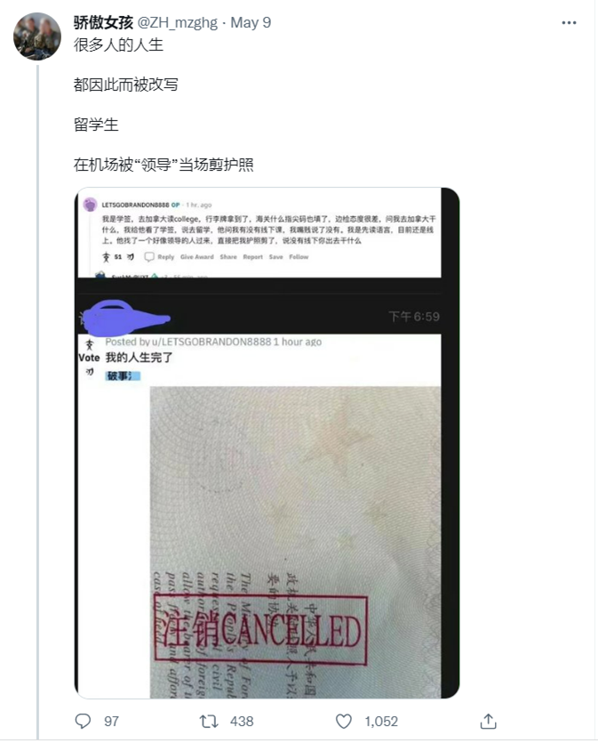 除“u/LETSGOBRANDON8888”外,近日在中文网络上还有多条声称中国公民在出入中国时护照被剪的消息。例如4月30日前后,推特用户@Ellie74607057声称,自己的两个朋友“从虹桥机场乘机回法国,千辛万苦到了机场却被收走护照和法国居留卡”。
