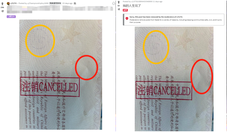 Reddit记录显示,5月2日,“u/LETSGOBRANDON8888”在一个叫“r/CLTV”的中文社群上传了显示“护照被注销”图片。