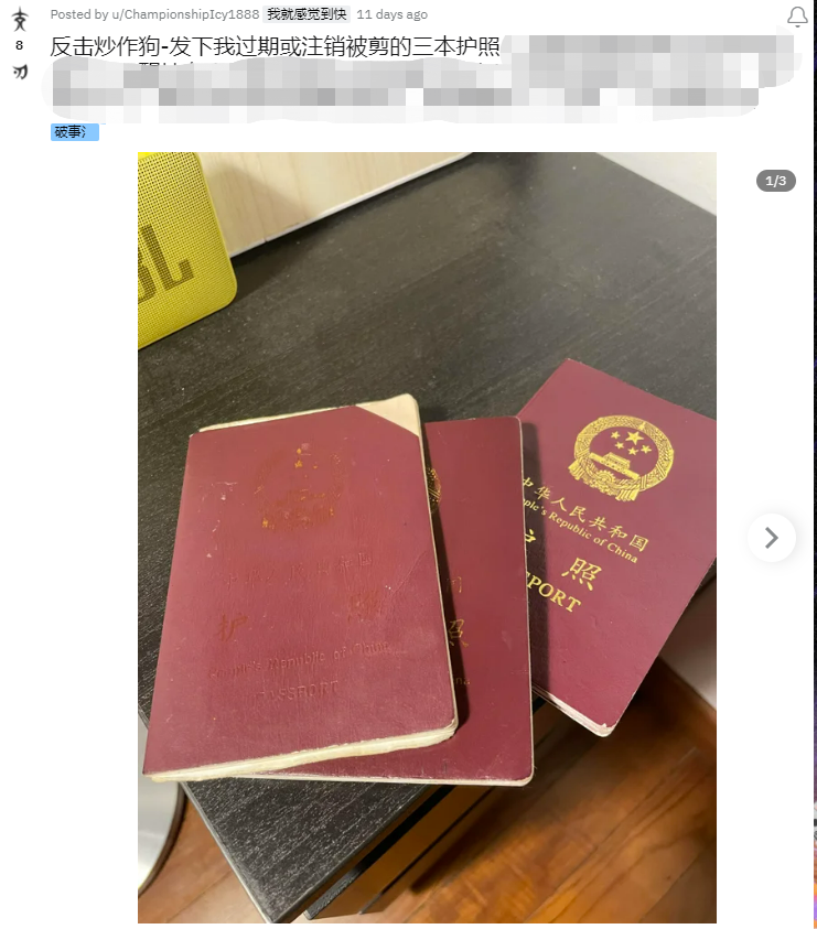 5月2日下午6时37分,用户名为“u/ChampionshipIcy1888”的Reddit用户在“r/CLTV”发帖称,“u/LETSGOBRANDON8888”盗取了其拍摄的注销护照图,被其“一眼发现”。为证明其说法,“u/ChampionshipIcy1888”在当天晚上10时33分再度发帖,展示了其本人已过期或注销被剪的三本护照。