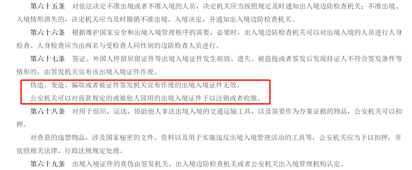 《中华人民共和国出境入境管理法》第六十七条规定,“伪造、变造、骗取或者被证件签发机关宣布作废的出境入境证件无效。公安机关可以对前款规定的或被他人冒用的出境入境证件予以注销或者收缴。”图片截自国家移民管理局网站。