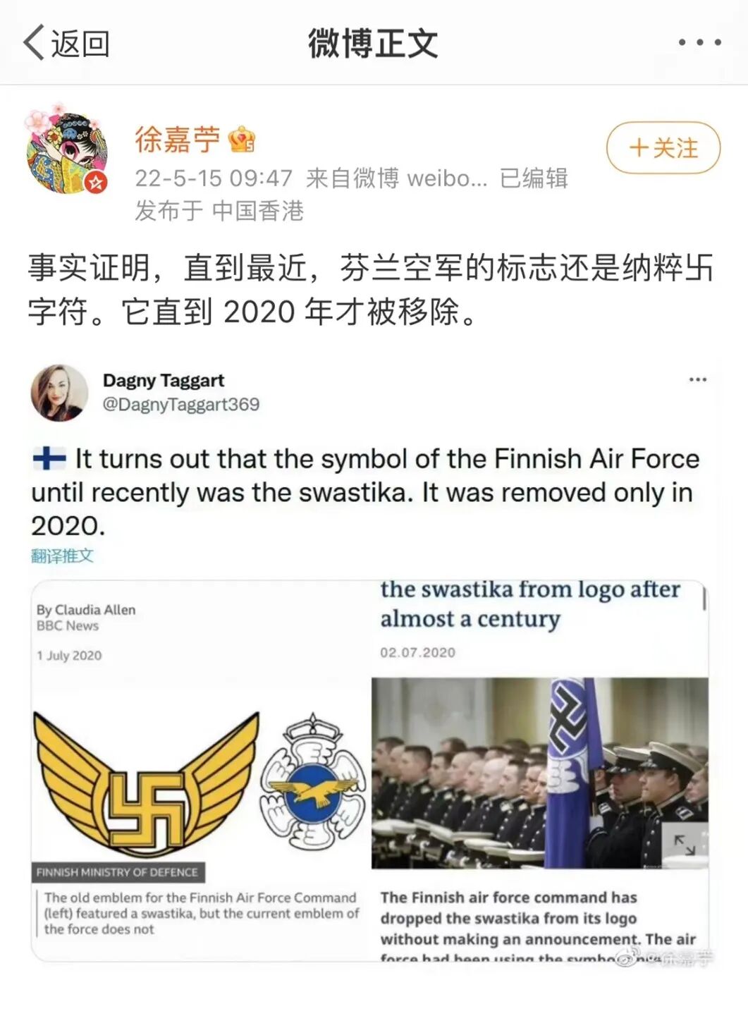 消息传出后,部分微博、推特用户在社交平台贴出了大量带“卐”字符号的图片,称芬兰空军以“卐”字符为标志,暗示芬兰支持“纳粹”。