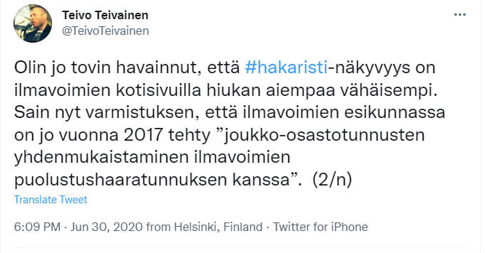 特伊瓦伊宁在2020年6月30日发布推文,披露了芬兰空军更改其徽章一事。
