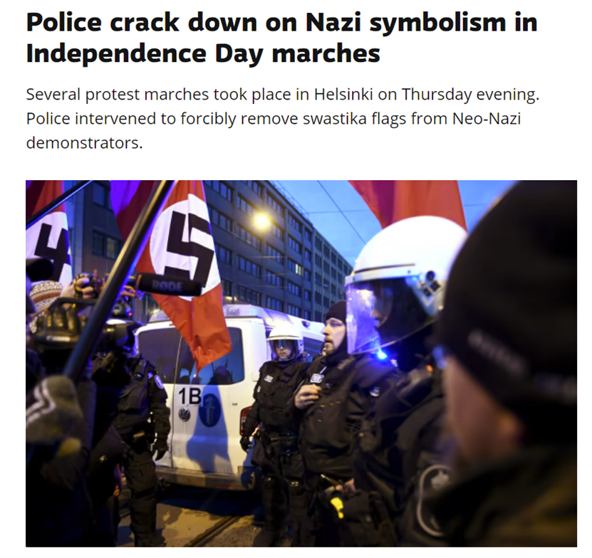 尽管极右翼与反法西斯者的对抗在近年来几乎已成为芬兰独立日的保留节目,但发生在2018年12月6日的“警察没收纳粹旗帜”的行为仍然引起了芬兰境内的激烈辩论,因为芬兰并未明确立法禁止“卐”字旗的使用。芬兰前总统塔里娅·哈洛宁(Tarja Halonen)在2018年12月8日接受YLE采访时表示,呼吁考虑对展示纳粹标志进行更严格的限制,但她认为,对某些类型的象征物颁布禁令不一定能起到帮助,因为“价值观必须内化,而立法对于引导人们行善并不十分有效”。