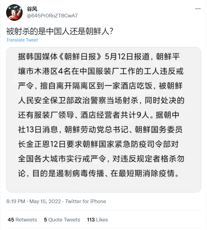 近日,一则关于朝鲜疫情的消息在推特、微信等平台流传。消息称,韩国媒体《朝鲜日报》在5月12日报道,有4名在中国工厂工作的工人因为违反戒严令、擅自外出用餐,被“朝鲜人民安全保卫部政治警察”当场射杀,包括工厂领导、酒店经营者在内的另外9人也被处决。