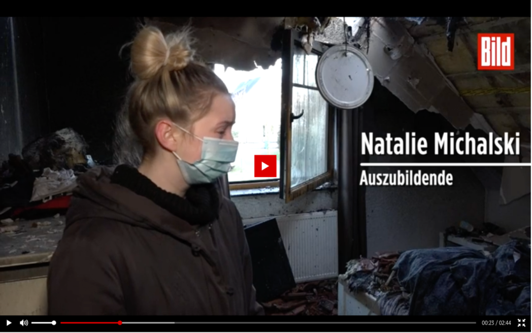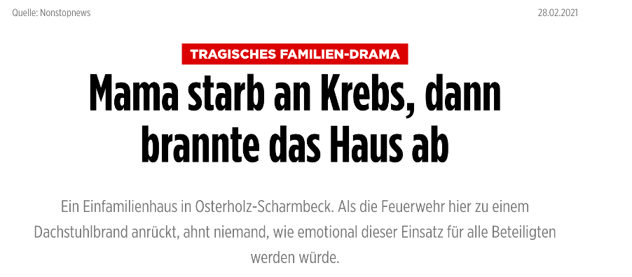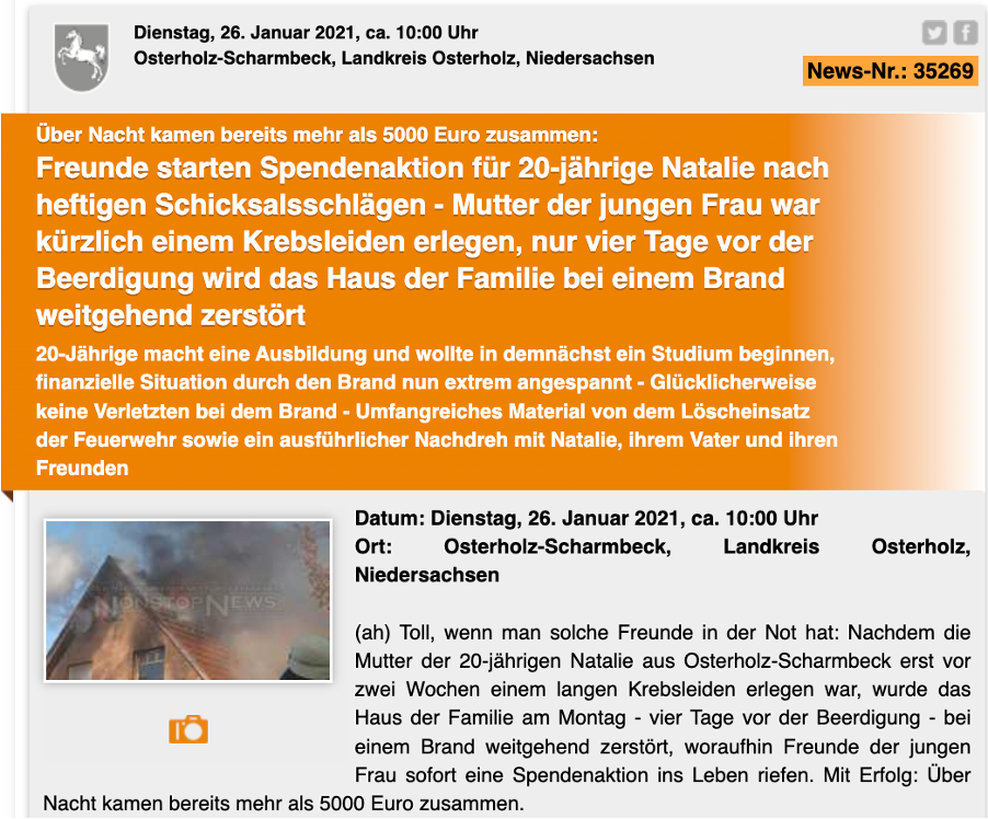 2021年2月28日,《图片报》援引一家名为“不间断新闻”(Nonstop News)的媒体,报道了一起发生在下萨克森州(Niedersachsen)奥斯特霍尔茨区(Landkreis Osterholz)的房屋起火事件。视频中,受害者娜塔莉·米哈尔斯基(Natalie Michalski)指着一片废墟,抽泣哽咽道:“不知道什么原因,你什么都认不出来了。那是我睡觉的地方。”