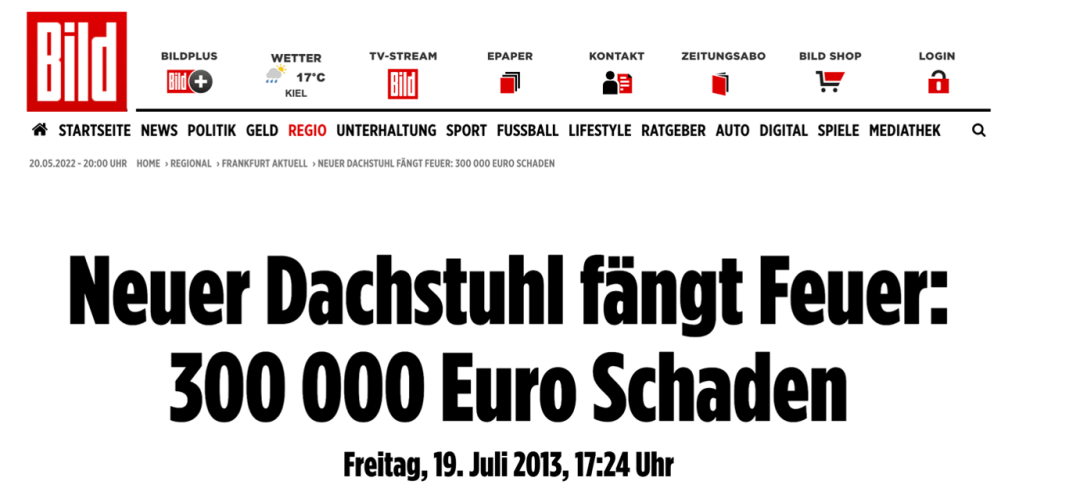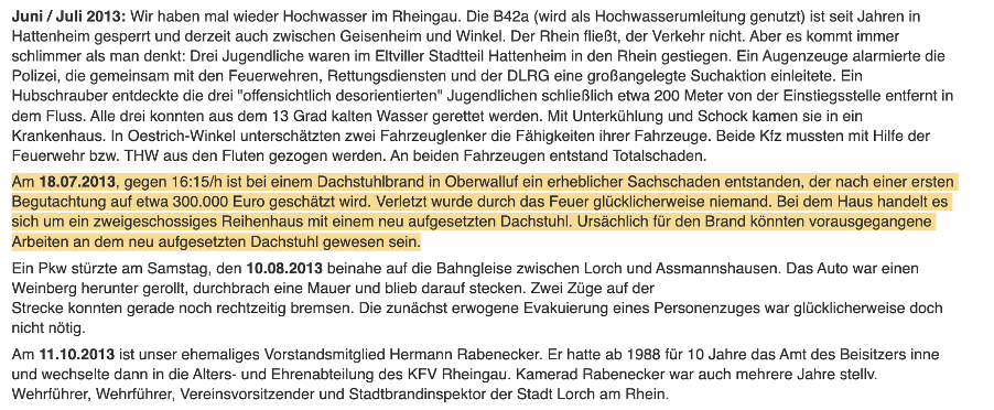 据莱茵高地区消防队协会网站上的火灾记录,这场火灾发生于2013年7月18日下午4点15分左右。报告写道:“上瓦鲁夫的一场屋顶桁架火灾造成了相当大的物质损失,据初步评估,损失达约30万欧元。幸运的是,火灾没有造成人员受伤。这所房子是一栋两层楼的楼房,带有新安装的屋顶桁架。火灾可能是由此前在屋顶结构上的施工所导致的。”
