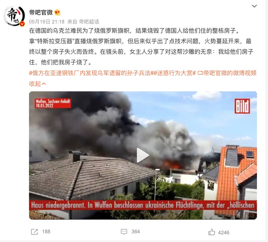 近日,有网友在微博上发布一则视频,据称是“在德国的乌克兰难民为了烧俄罗斯旗帜,结果烧毁了德国人给他们住的整栋房子”。视频时长30秒,由三部分拼接而成。前10秒展示了一个“特斯拉变压器”焚烧俄罗斯国旗的过程,中插7秒,一房屋着火,升起滚滚浓烟。随后有一女子站在废墟焦土之中接受采访。微博网友形容这一幕为“女主人分享对这帮沙雕的无奈:我给他们房子住,他们把我房子烧了”。