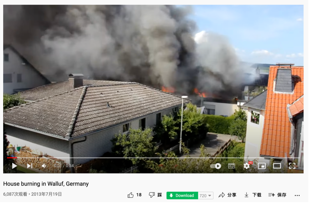 使用InVid视频分析工具截取视频关键帧进行反向搜索,发现以上民宅着火画面出现于一则2013年7月19日上传的YouTube视频。视频下方描述写道,这座民宅位于德国黑森州(Hesse)莱茵高-陶努斯县(Rheingau-Taunus-Kreis)的瓦卢夫(Walluf)。