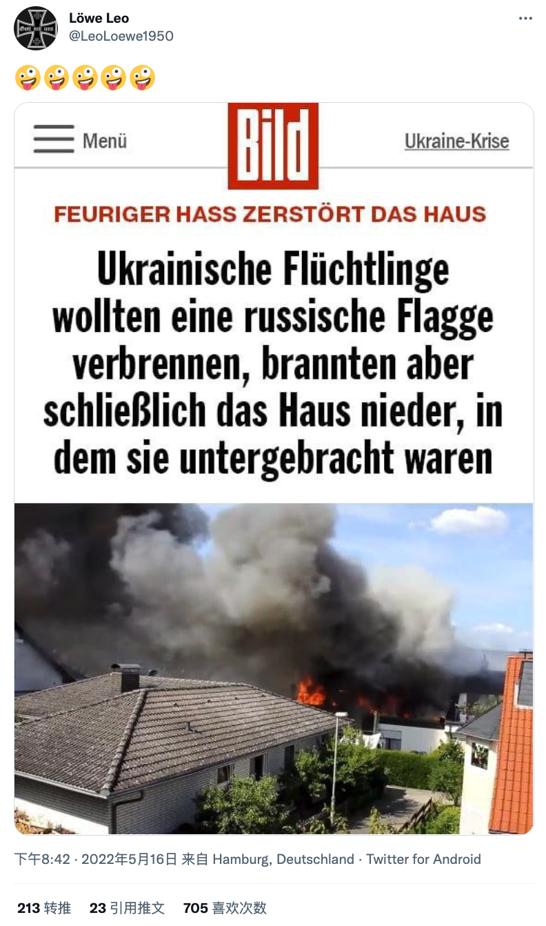 “在德乌克兰难民烧俄罗斯国旗点燃安置房”消息不实。原视频假借《图片报》名义广为传播,但已为《图片报》副主编辟谣。