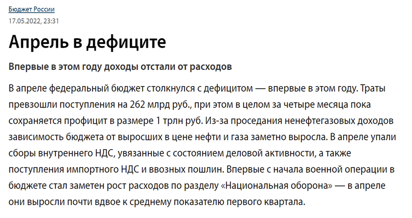 然而,这两家媒体在报道中同时提到,就2022年4月来说,俄联邦财政预算处于赤字状态,赤字数额达到了2623亿卢布。