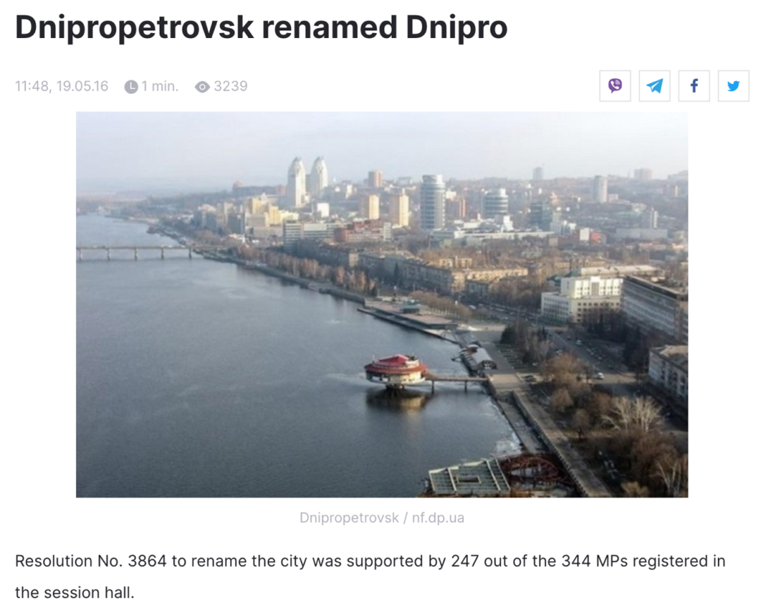 乌独社关于第聂伯罗彼得罗夫斯克更名第聂伯罗的报道。