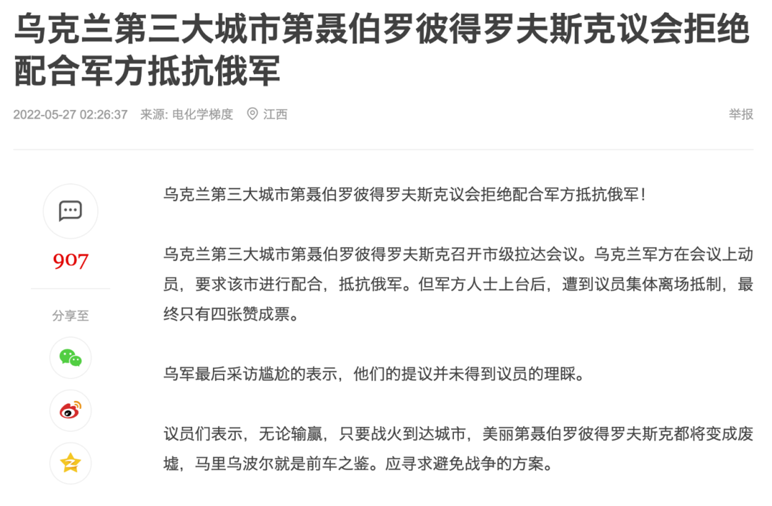 5月27日,网易号“电化学梯度”发帖称,乌克兰第三大城市第聂伯罗彼得罗夫斯克召开市级拉达会议。乌克兰军方在会议上动员,要求该市进行配合,抵抗俄军。但军方人士上台后,遭到议员集体离场抵制,最终只获得四张赞成票。