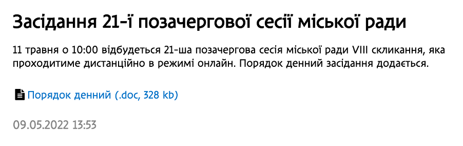 分别用俄语、乌克兰语在谷歌上搜索“第聂伯罗市议会 俄军”(第聂伯罗彼得罗夫斯克乃旧称),均未发现网传说法。登录第聂伯罗市议会官方网站查看近期会议记录,可知第聂伯罗市议会最近一次临时会议发生在5月11日,以线上形式远程召开。此次临时会议主要围绕财政预算、城市规划、组织人事等议题展开,并不包括“配合乌军抵抗俄军”相关议程。