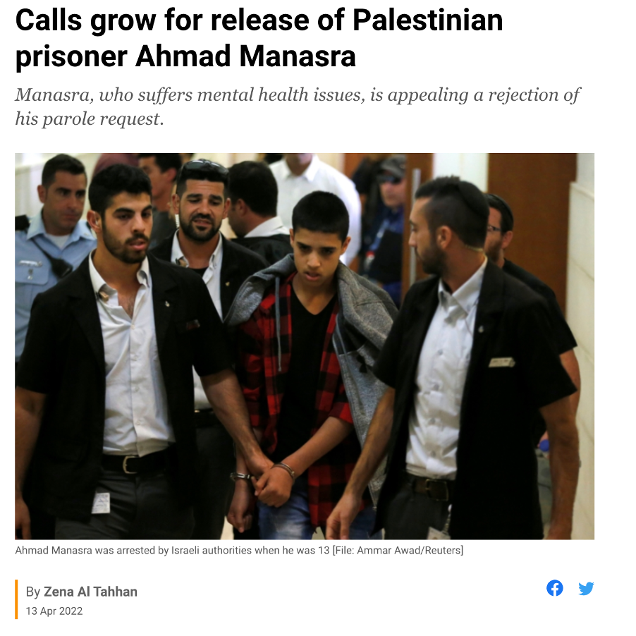 据半岛电视台今年4月13日报道,以色列比尔谢巴(Be’er Sheva)地区法院就此案举行听证会。多年来,艾哈迈德·马纳斯拉遭受严重的心理疾病,马纳斯拉的代理律师向法院提出上诉,要求特别监狱委员会重审马纳斯拉的假释请求。