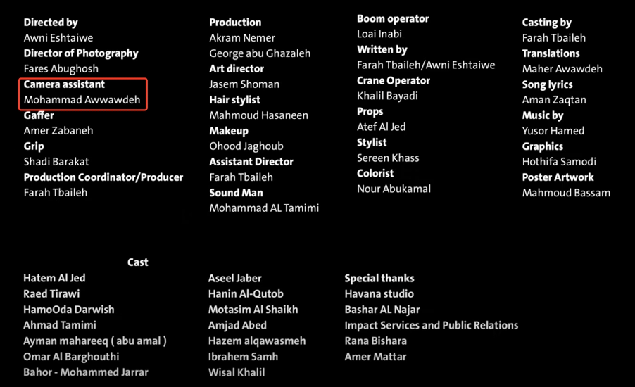 短片最后的工作人员名单中,可以找到花絮上传者穆罕默德·阿瓦德(Mohammad Awwawdeh)的名字。名单显示,阿瓦德是此影片的摄影助理。