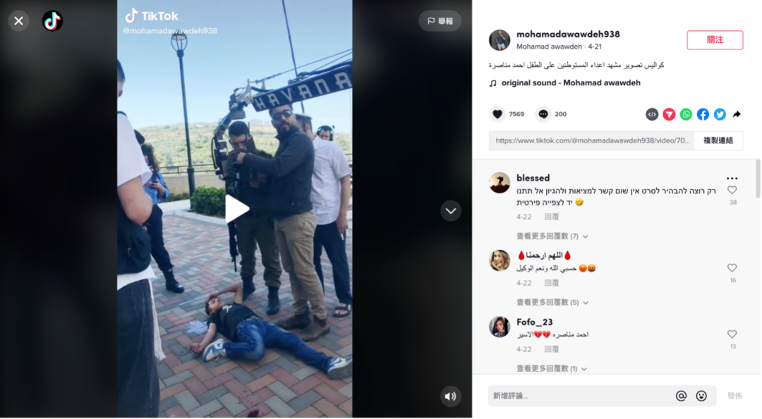 网传视频画面上有TikTok的水印,但是相应的账号已经刻意被用蓝色记号抹去。使用InVid视频分析工具截取关键帧,反搜结果显示,原视频由一名为“mohamadawawdeh938”的TikTok用户上传于4月21日。mohamadawawdeh938表示,这是关于艾哈迈德·马纳斯拉故事的拍摄花絮。
