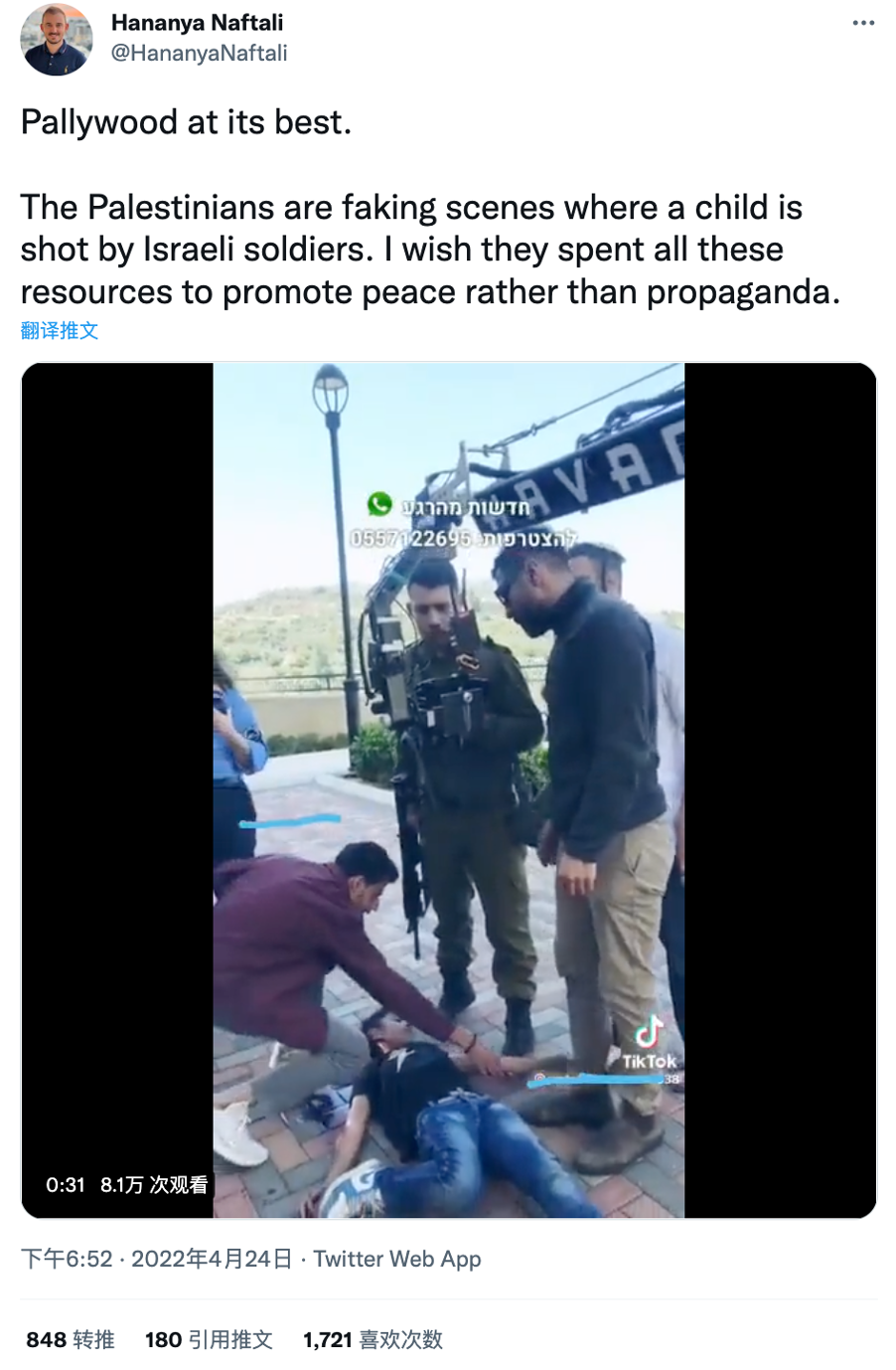 在推文中,该网友使用了“巴莱坞”(Pallywood)这一合成词。“巴莱坞”一词糅合了“巴勒斯坦”(Palestine)和“好莱坞”(Hollywood),最早由美国历史学家理查德·兰德斯(Richard Landes)创造,用以形容一些巴勒斯坦人为煽动国际社会的反以情绪而进行的所谓媒体操纵。