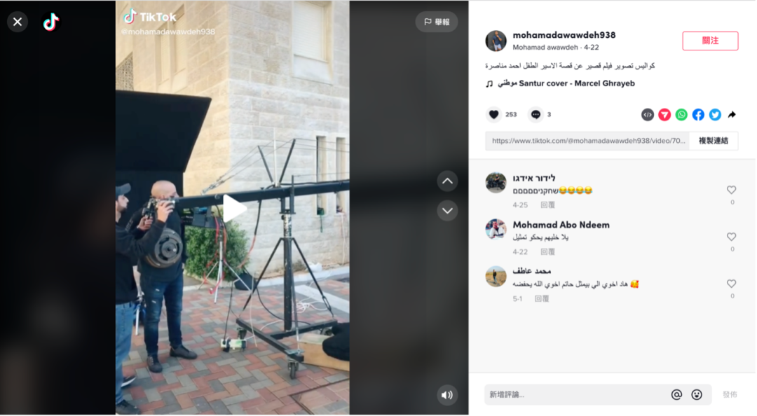 除网传视频外,mohamadawawdeh938还于次日上传了另一则布景相同的短片,并再加解释道,这是“在拍摄一部关于儿童囚犯艾哈迈德·马纳斯拉故事的短片幕后”。