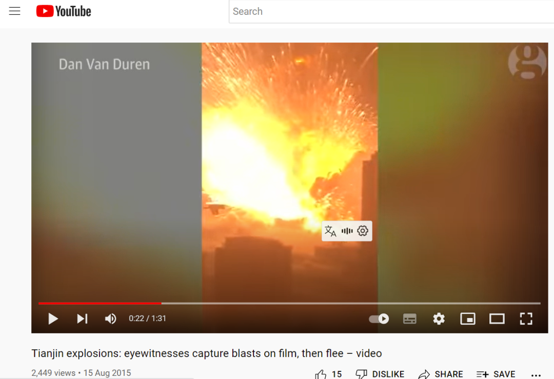点击其中一个标注为“天津爆炸:目击者捕捉并拍摄到爆破声,然后逃跑了”的油管视频进入,将其和Chaudhary Parvez发布的视频进行比较,可以发现后者对前者视频中的部分内容进行了截取。而这一油管视频早在2015年8月15日就已经被一名叫Andre Simoni的油管用户上传到了平台,且视频的左上角和右上角分别有“Dan van Duran”字样和英国《卫报》的标志。进一步检索资料可知,这段视频是由一个叫Dan van Duran的美国人和其女友在2015年8月14日于天津一座34层楼的公寓楼中拍摄的,包括美国NBC在内的多家媒体对Duran及相关事件进行了报道。