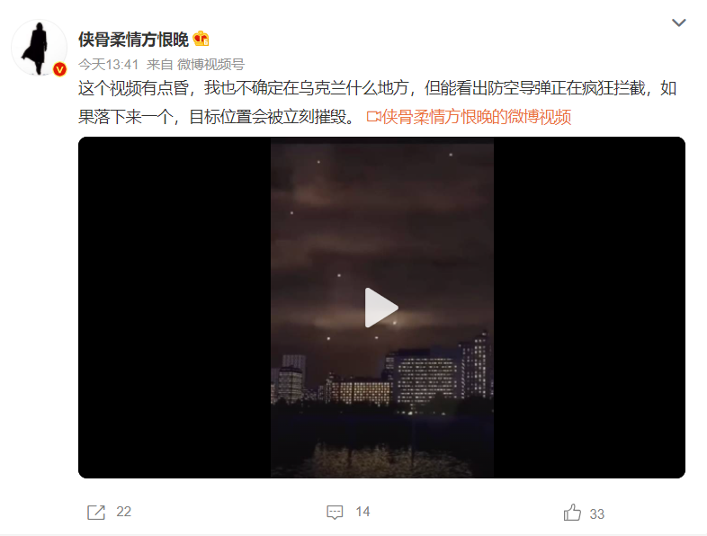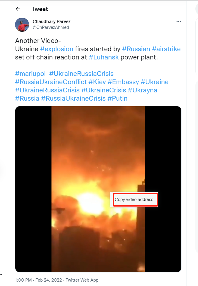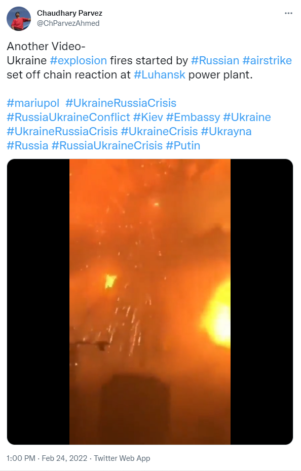 帕瓦兹没有错过这样的时刻。北京时间24日下午1点整,这位推特用户发布了一段展现城市发生爆炸的视频,声称这是“俄军轰炸乌克兰卢甘斯克发电厂”,并不忘带上了12个与“俄乌冲突”有关的“#”标签。视频中,一座城市的高楼附近发生爆炸,火光照亮了整个天空,且引发了连锁反应,视频的拍摄者发出了激动的叫喊。