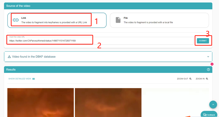 第二步:打开InVid关键帧(KeyFrame)工具,输入链接或将下载的视频上传至InVid,点击提交按键,软件将自动提取出视频中的关键画面,并以平铺的方式展现。