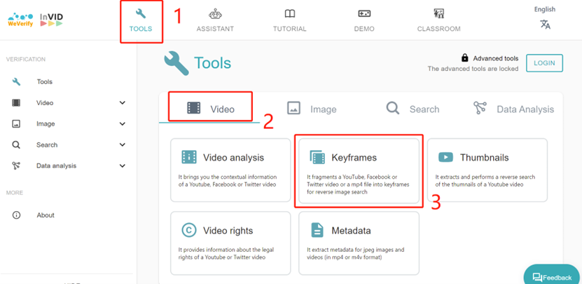 这里我们以Chrome浏览器上的InVid插件为例:在打开插件后,我们分别点击下图中所示的“工具”-“视频”-“关键帧”栏目,就可以打开软件提供的“关键帧搜索”工具界面。