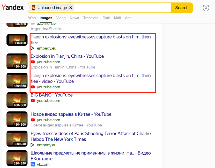 Yandex图片反搜结果显示相关关键帧与中国天津爆炸视频有关。