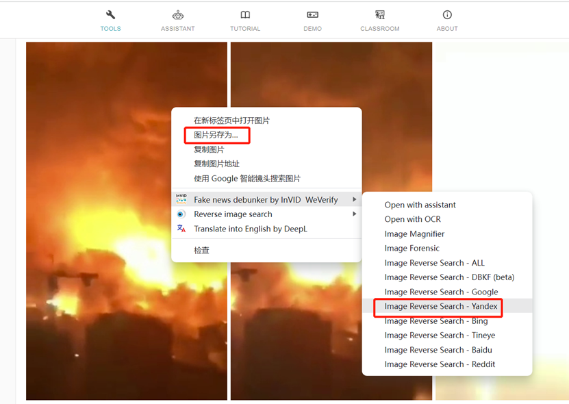 挑选一张关键帧,点击右键将图片保存后使用之前分享的反向图片方法,或使用InVid插件直接对相应图片进行反搜,则可以在Yandex网站上看到一系列与关键帧图片具有相似画面的视频,多个反搜结果中出现了“天津 中国 爆炸”等关键词。