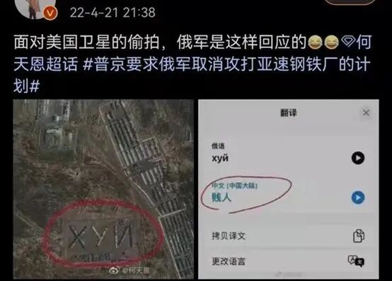 4月下旬,中文网络流传消息称,面对美国卫星的偷拍,俄军在其军事要地摆出了俄语单词“xуй”以回应。此前国内外社交平台有消息称“谷歌地图从4月18日起以最大分辨率提供俄罗斯所有军事和战略设施卫星图像”,“澎湃明查”核查后发现此事并无实证,且谷歌公司否认了相关说法。