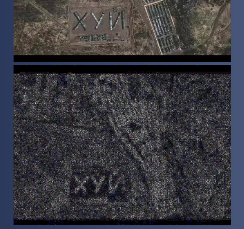 需要注意的是,FotoForensics等工具并不会直接告知上传图片是否有编辑痕迹,这需要核查员结合理论知识自行判断。例如在下图中,我们可以看到,图片中显示单词“xуй”部分的地理材质和颜色和周围如画面正中呈长条状分布的装甲设备摆放处是十分接近的,但显示单词部分在ELA模式下的对比度却要较周围环境更高,这说明此处的图片很有可能被做过更多处理。