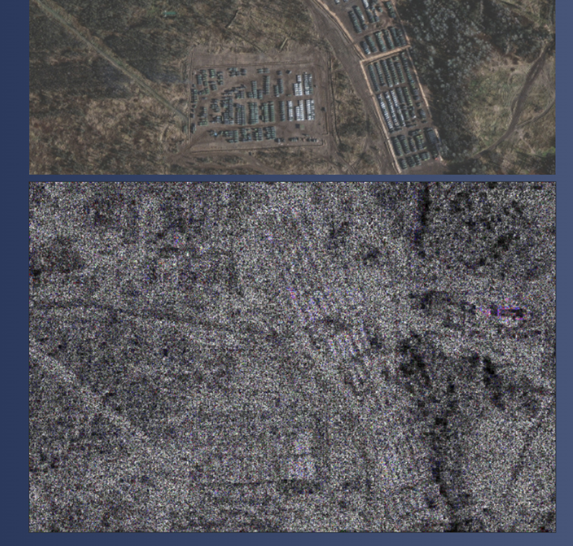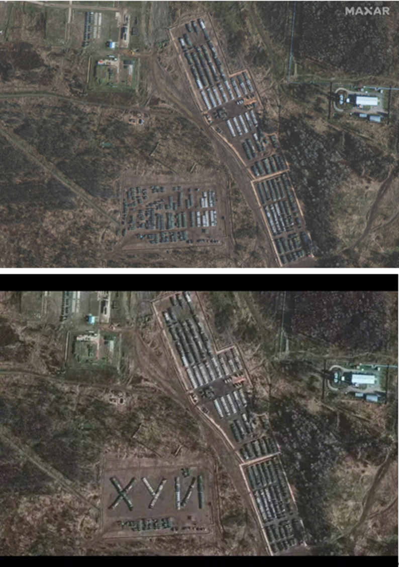 然而,MAXAR的卫星图和网传图片尽管相似,但存在细节上的差别。其中最明显的就是网传图片中下方的装甲设备的摆放形状较卫星图有明显不同,且卫星图右上角标注的“MAXAR”水印被截去了。除此之外,两张图片的地貌特征、光影和画面正中呈长条状分布的装甲设备摆放位置几乎可以完全重合,这会不会意味着网传图片是在原卫星图基础上进行了后期修改呢?