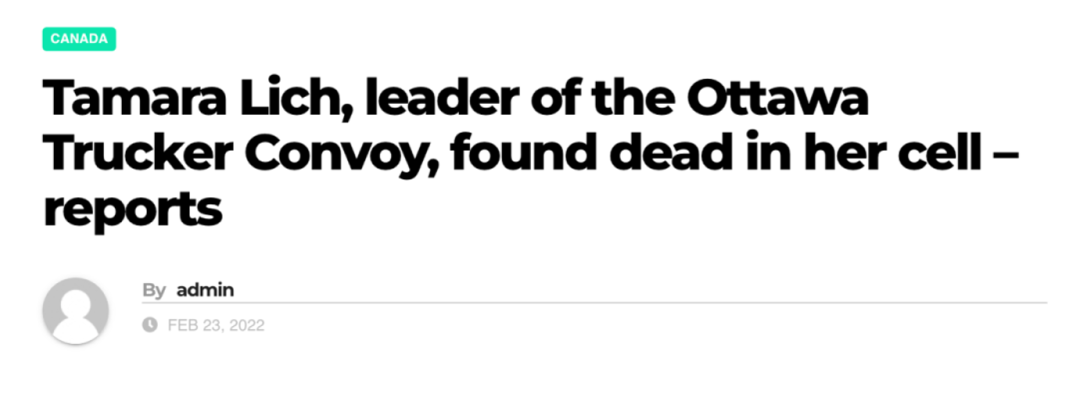此外,今年3月,《温哥华时报》还发布了一篇题为《渥太华卡车游行领袖塔玛拉·利奇被发现在监狱中死亡》(Tamara Lich, leader of the Ottawa Trucker Convoy, found dead in her cell)的报道(现已删除),援引匿名信源声称利奇之死十分“可疑”,并非自杀。然而,这则消息旋即被证明为假新闻。渥太华市所在的上级行政区安大略省法务厅工作人员当日即出面辟谣,表示“在过去的24小时之内,安大略省惩教设施中没有任何女性囚犯死亡。”