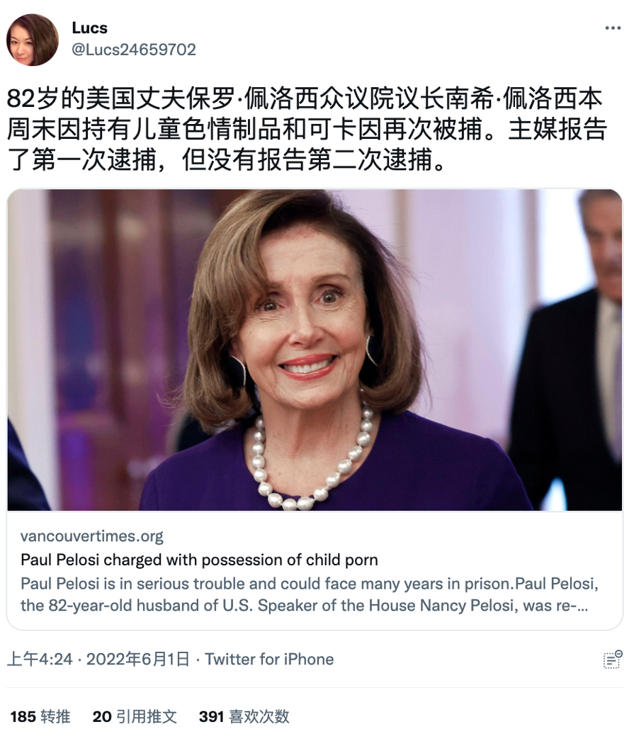 近日,有推特网友声称,保罗·佩洛西(Paul Pelosi)“因持有儿童色情制品和可卡因被捕”。作为依据,该网友引用了一篇来自《温哥华时报》(Vancouver Times)的文章。