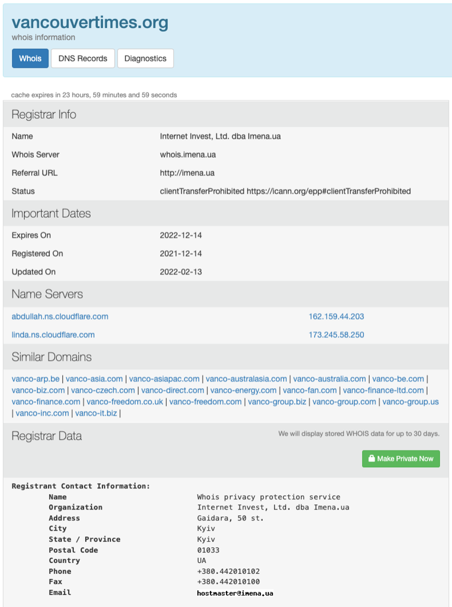 此外,尽管《温哥华时报》这一名称听起来似乎是一个老牌地域性媒体,但是使用whois域名查询工具查询其vancouver.org,结果显示,该网站创建时间为2021年12月,是由乌克兰首都基辅的一家名为“Imena”的公司代为注册的。也就是说,一家名义上的温哥华当地媒体,注册地居然在万里之外的基辅,这不得不令人生疑。