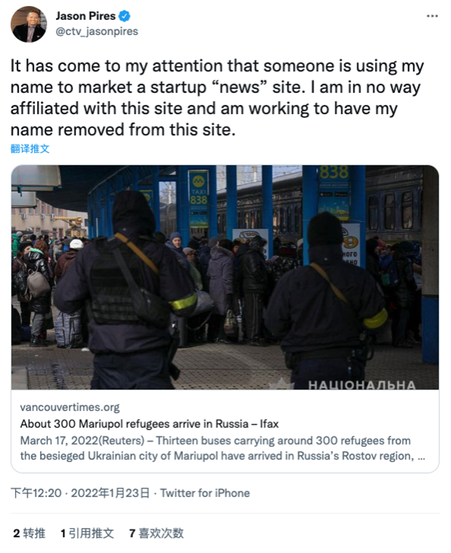 经查证,加拿大的确有一名为“杰森·派尔斯”的知名媒体人。他供职于加拿大电视(CTV)温哥华频道,是《早间新闻》频道的主持人。今年1月,他在推特上表示,《温哥华时报》的“杰森·派尔斯”乃是冒用。他写道:“有人用我的名字来推销一个创业‘新闻’网站。我同这个网站没有任何关系。我正在努力把我的名字从这个网站上移除。”
