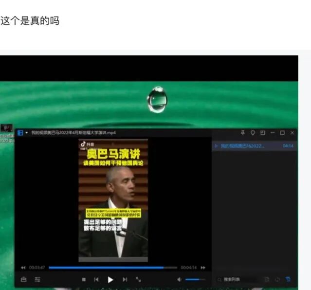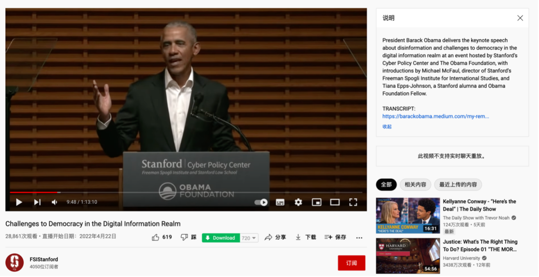 经查证,截图片段出自今年4月21日奥巴马在斯坦福大学一次研讨会上的讲话。该研讨会以“数字信息领域中对民主的挑战”(Challenges to Democracy in the Digital Information Realm)为主题,由斯坦福网络政策中心(Stanford Cyber Policy Center)和奥巴马基金会(Obama Foundation)联合主办。