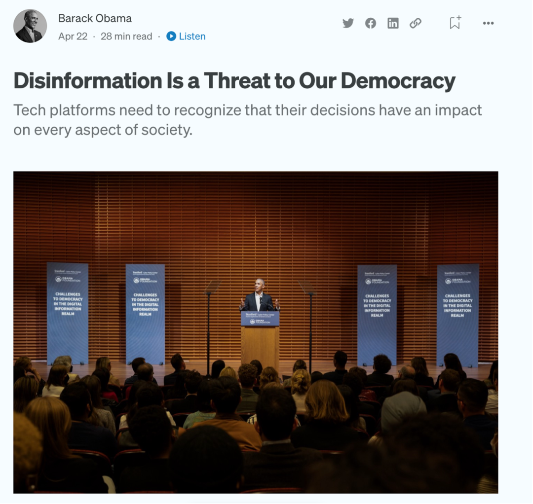 在这次研讨会上,奥巴马发表了名为“虚假信息是对我们民主的威胁”(Disinformation Is a Threat to Our Democracy)的主题演讲。演讲全程长达1小时,已上传至斯坦福大学弗里曼·斯波利国际研究所(Freeman Spogli Institute)的YouTube频道。演讲全文也可以在奥巴马个人Medium专栏找到。