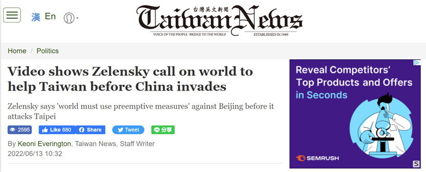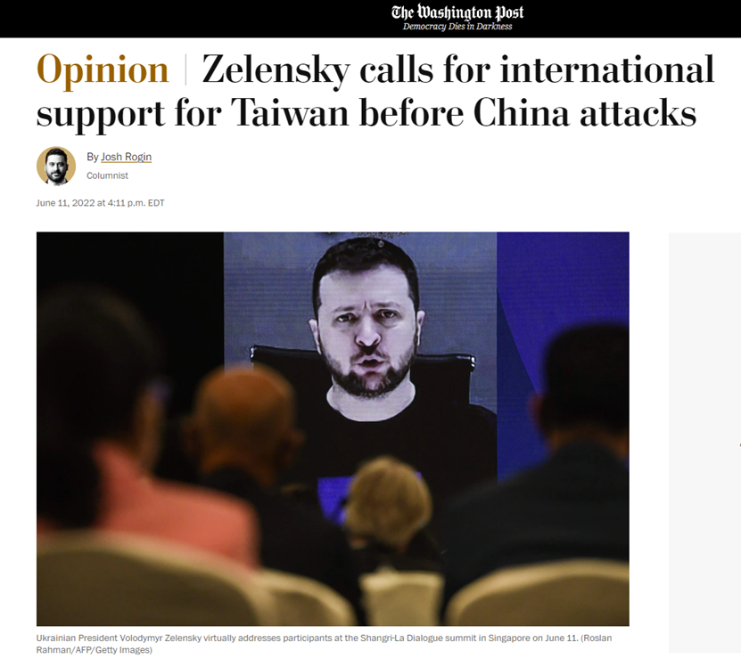 《台湾英文新闻》报道称乌克兰总统泽连斯基 “呼吁国际社会在中国进攻前支持台湾”的说法来自《华盛顿邮报》专栏作家乔什·罗金,但这不是泽连斯基的原话。