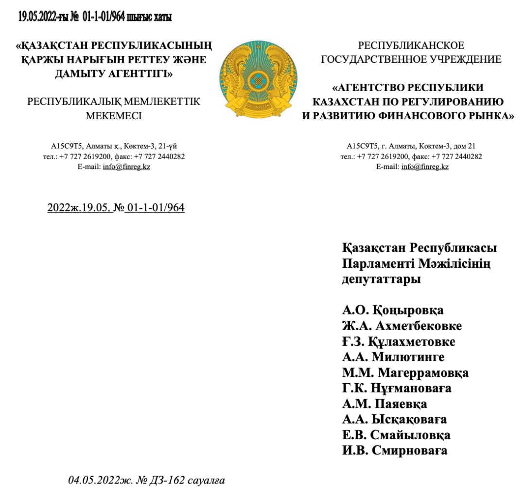 哈萨克斯坦金融市场监管与发展局5月19日文件。