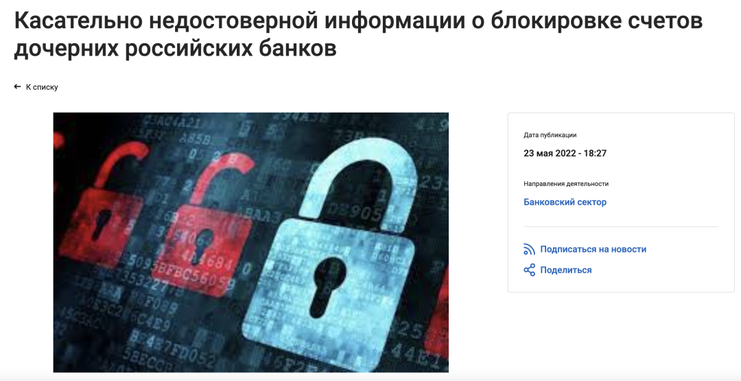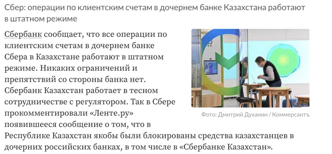 “哈萨克斯坦共和国金融市场监管和发展局通知,有关该机构冻结了俄罗斯附属银行中资金的说法不足信。此外,有关哈萨克斯坦封锁俄罗斯银行资产的消息也不可信。”