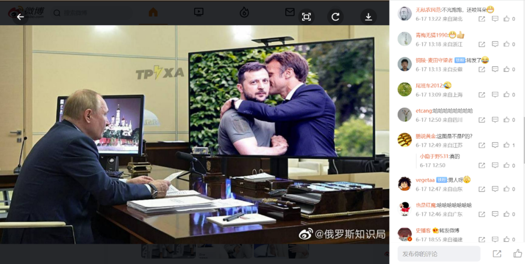近日,有微博用户分享一张图片,显示俄罗斯总统普京在屏幕前,看着法国总统马克龙热情拥抱乌克兰总统泽连斯基。评论区有网友提问:“这图是不是P的?”