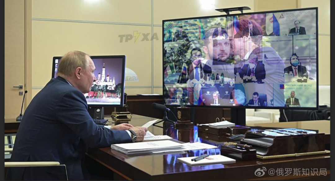 微博用户发布的这张“普京在屏幕前看马克龙拥抱泽连斯基”的图片进行过后期处理,原图来自于俄罗斯卫星通讯社,展现的是今年1月普京在莫斯科与意大利商人视频连线一事。