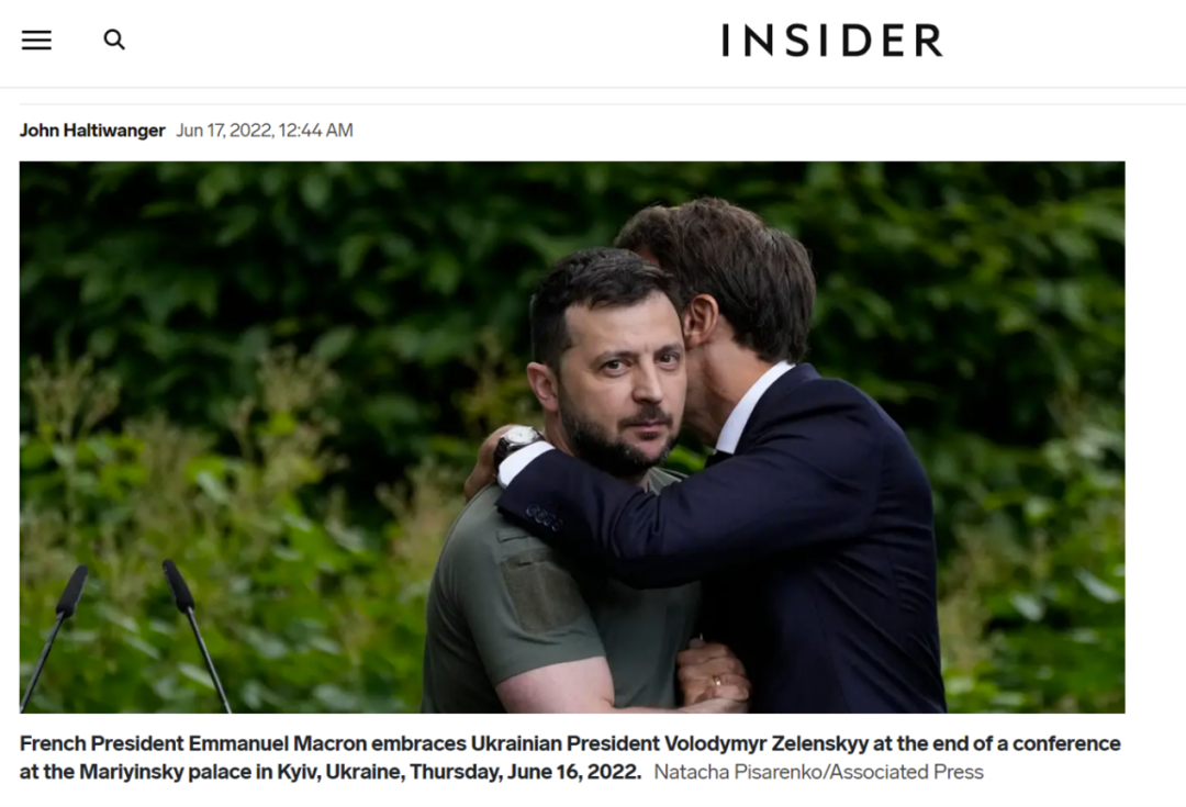 另一方面,网传图片中显示的马克龙拥抱泽连斯基的画面源自何处呢?使用Google Lens提取相关画面,再进行反搜,即可发现此图出自于16日马克龙同其他欧洲国家领导人访乌时与泽连斯基共同参与的一场媒体见面会,网络上流传有大量与此会议相关的图片及视频。而这张显示马克龙与泽连斯基拥抱的图片近日引起了媒体热议,《商业内幕》《每日快报》《每日邮报》等多家媒体对此图片进行报道,认为泽连斯基的表情看起来不是那么“舒服”,似乎有些尴尬。