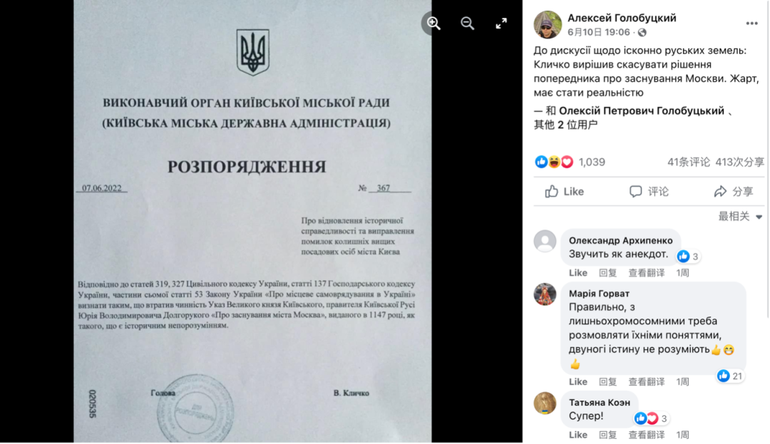 但是,Michael MacKay并非这一消息的首位传播者。此前,乌克兰政治评论家阿列克谢·格罗布茨基(Алексей Голобуцкий)在个人脸书上发布了这张疑似基辅市议会决议文件图片,并写道:“在讨论原有的俄罗斯土地之前:克里琴科决定取消他的前任建立莫斯科的决定。笑话必须成为现实。”