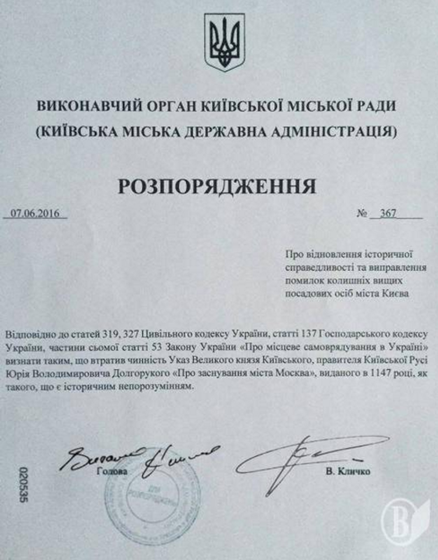 除此之外,文件显示编号为367号。搜索自2014年克里琴科上任以后,基辅市议会下属各部门签发的367号文件,并未发现任何有关“莫斯科”的表述。显而易见,不论是2016年还是2022年流传的所谓“克里琴科撤回建立莫斯科的法令”文件扫描图,皆为网友编辑处理而成。