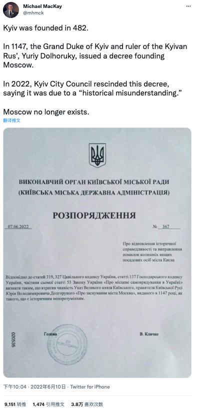 微博网友引用的消息源为一名为“Michael MacKay”的网友。Michael MacKay是一名深耕俄乌关系领域的政治评论家,博士毕业于伦敦政治经济学院,现居加拿大。他写道:“基辅始建于482年。1147年,基辅大公和基辅罗斯的统治者尤里·多尔霍鲁基 (Yuriy Dolhoruky) 颁布法令建立莫斯科。2022年,基辅市议会撤销了这项法令,称这是由于‘历史误解’。莫斯科已不复存在。”