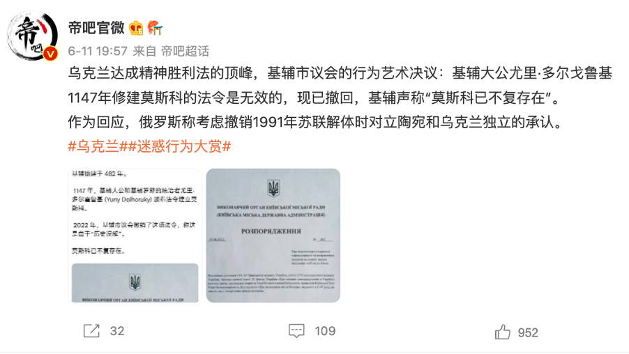 近来,在国内外社交平台上流传一种说法称,乌克兰首都基辅市议会通过一项决策,撤回基辅大公尤里·多尔戈鲁基1147年修建莫斯科的法令,并宣布“莫斯科已不复存在”。网友称之为“基辅市议会的行为艺术”“精神胜利法”。网友还表示,作为回应,俄罗斯称考虑撤销1991年苏联解体时对立陶宛和乌克兰独立的承认。
